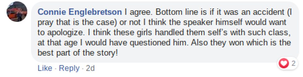 "And no... no one has reached out to the girls themselves to extend an apology....I'm sorry if I dont think that's too much to ask for. I am a proud mom .... I love these girls and I am so proud of the strength and dignity they displayed in moving past the madness and bringing home the district championship to CO for the first time in 20+ years!"