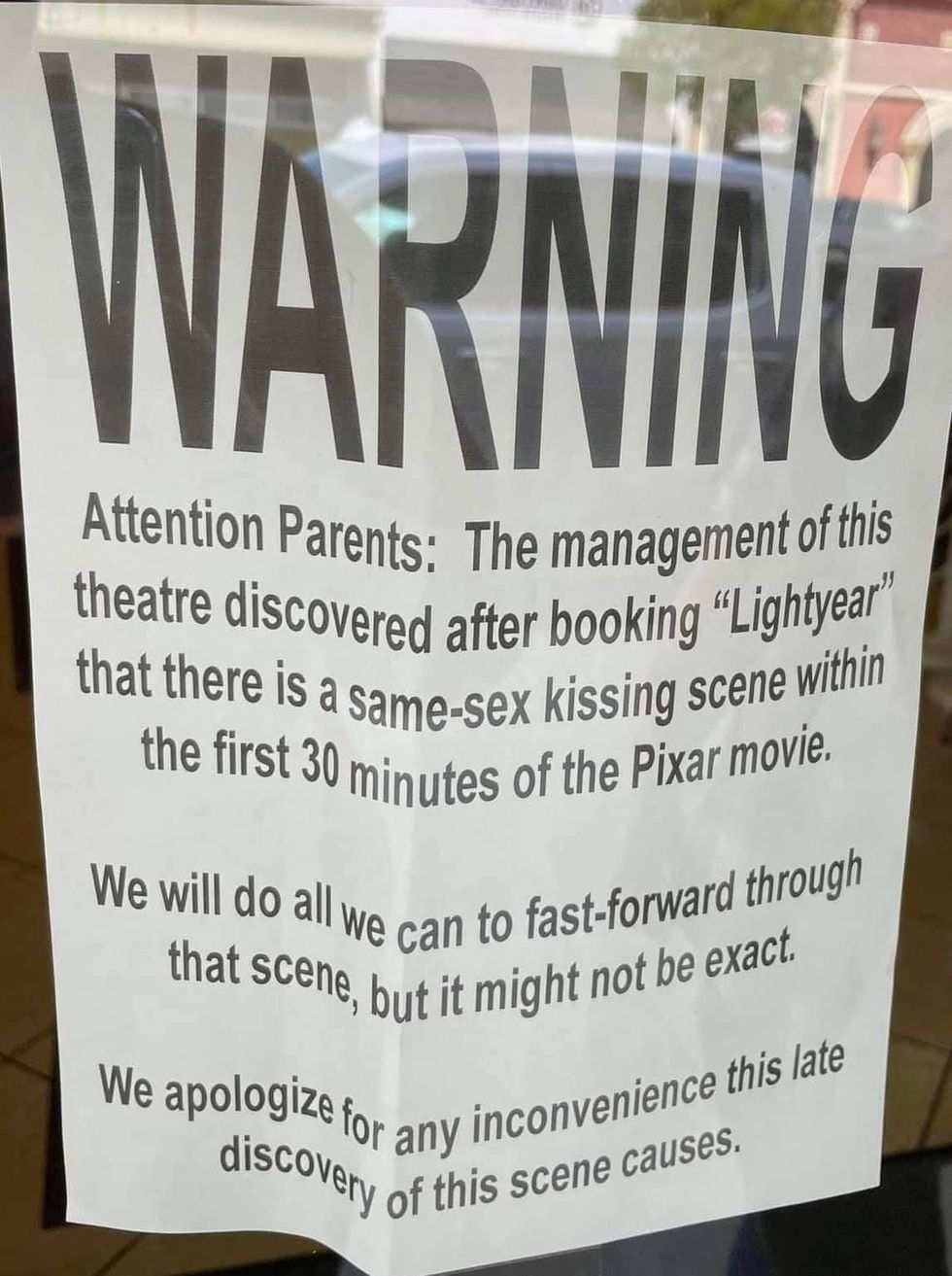 The management team of the 89er Theater in Kingfisher, Oklahoma posted a sign on the theater's front door warning parents about "a same-sex kissing scene within the first 30 minutes," promising to fast-forward through it while acknowledging its efforts to prevent patrons from seeing it “might not be exact.”