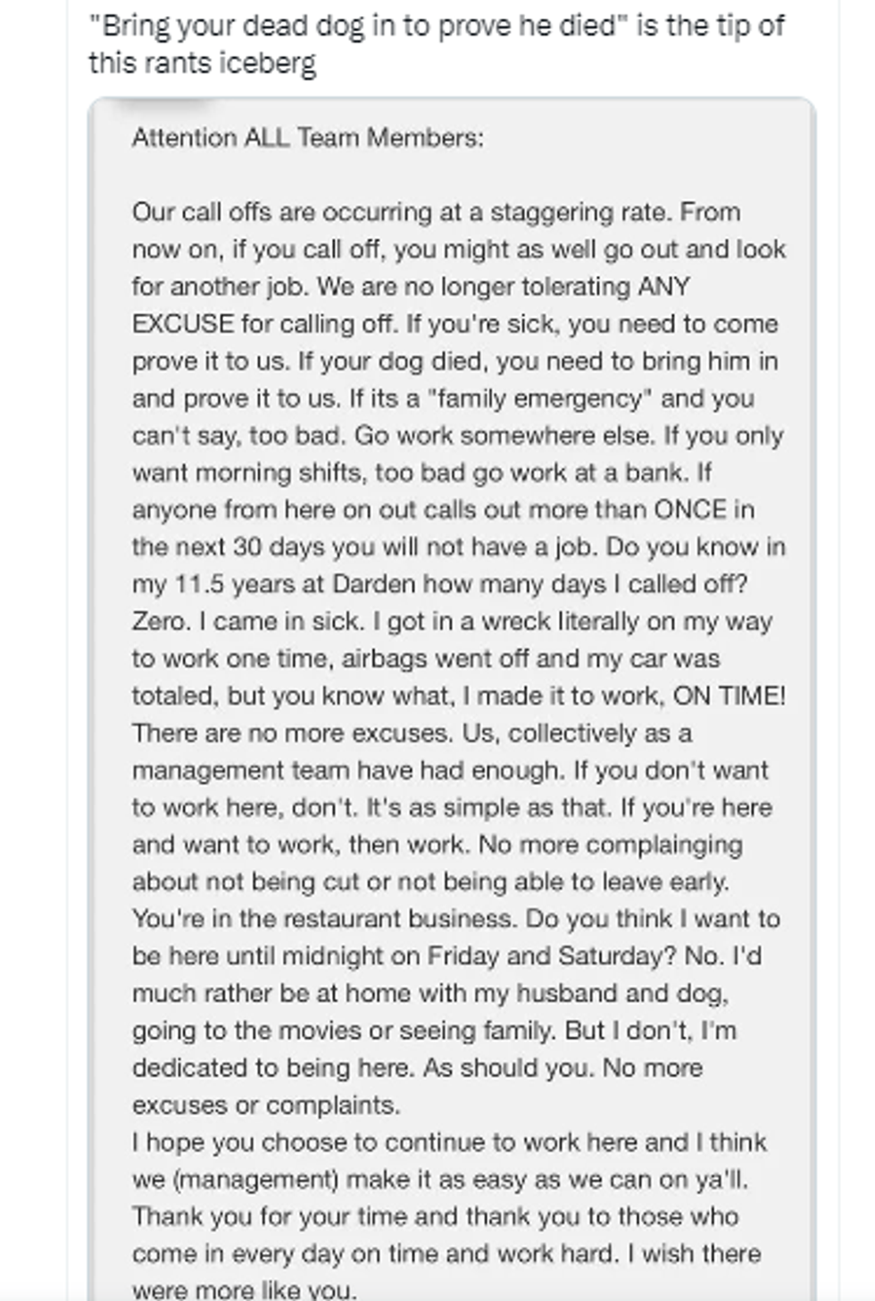 As if the first part wasn't bad enough, they then went on to warn employees “from here on out” anyone taking time off more than once in the next 30 days would find themselves without a job.