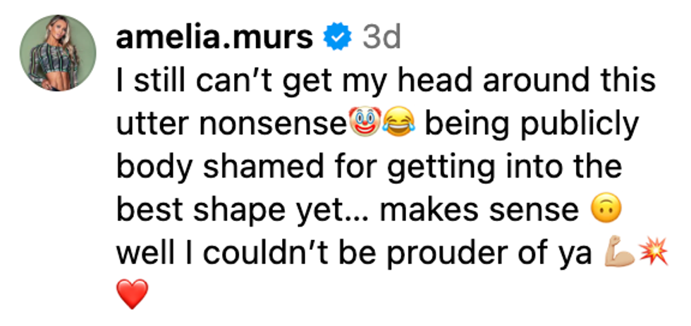 Murs's wife, Amelia, also joined in the comments, calling out the blatant body shaming her husband received, which she found all the more peculiar considering he got into the best shape of his life: