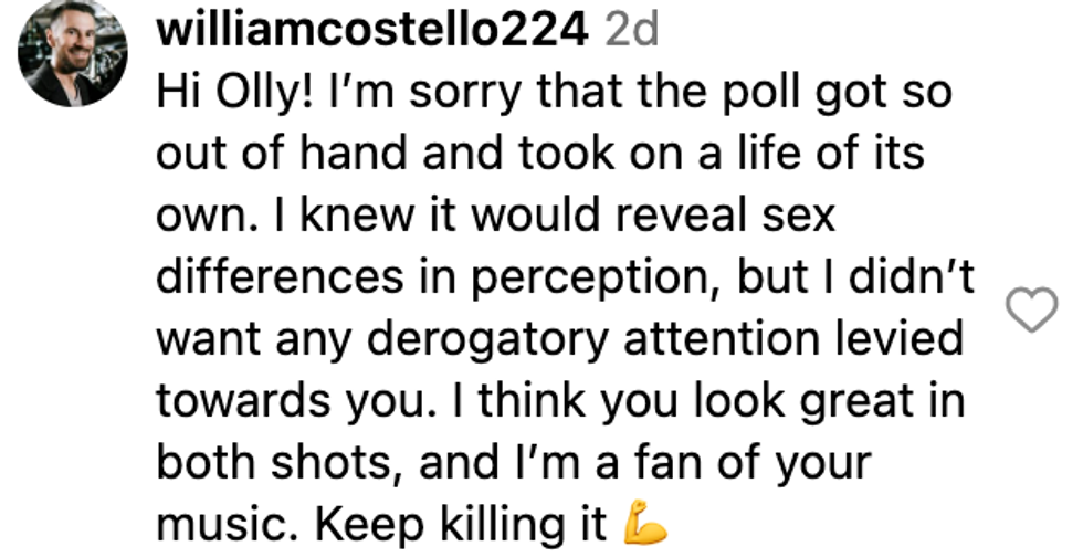 On his X (formerly Twitter) page @CostelloWilliam, Costello posted a survey, first asking participants if they identified as male or female, then if they preferred the "Please Don't Let Me Go" singer pre- or post-transformation: