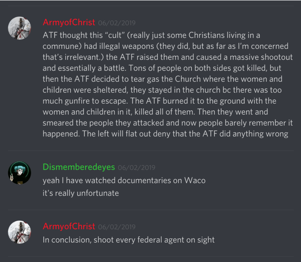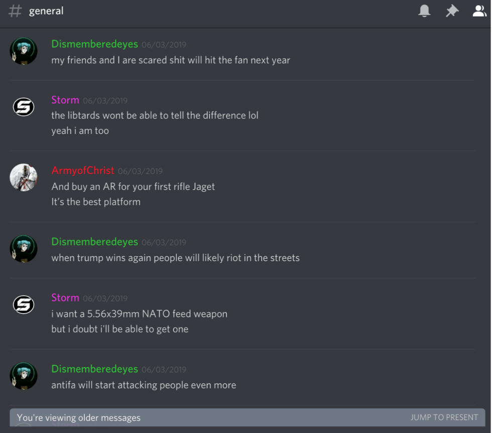 Within this Discord chat, Olsen made the threats that would eventually get him arrested, along with a slew of incendiary dialogue about the need for guns.