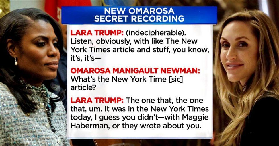 In the recording, you can hear Lara Trump, daughter-in-law of Donald Trump, tell Omarosa,