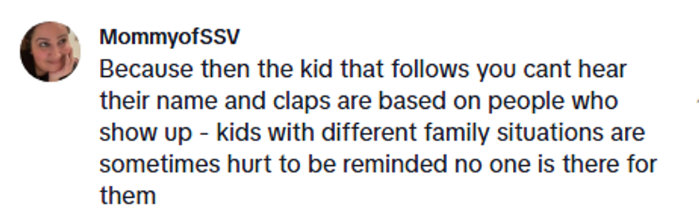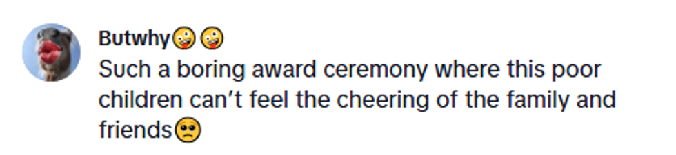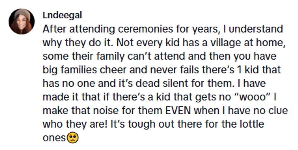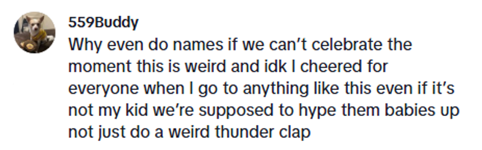 The mom filming attempted to clap a few extra times for some of the students, and one family gave a solitary "Whoo!" while clapping, but the crowd otherwise listened to the instructions.