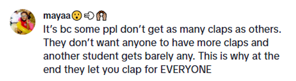 But more than likely, it had to do with social support, since there will always be some students present who either do not have any family or friends there to support them, or very few compared to other students in their class. By only allowing for one clap each, it offers the illusion of equality across the graduating class.