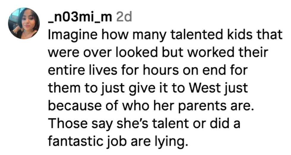 Recently, West was featured singing with dad Ye in his music video for his collaboration with Ty Dolla $ign on "Talking / Once Again."