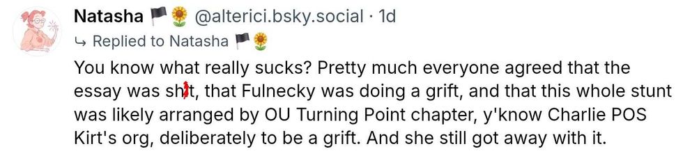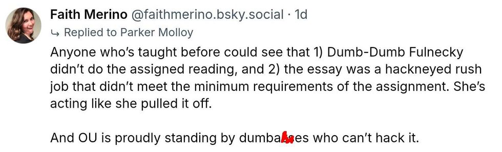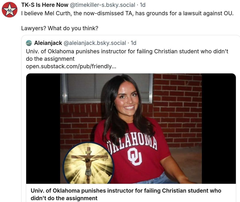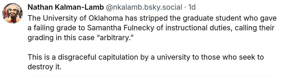 But none of that matters to the University of Oklahoma administrators who opted to fold to pressure from TPUSA and the MAGAsphere. In their statement, OU said it determined that Curth was "arbitrary" in grading the essay and would be stripped of her instructional duties.