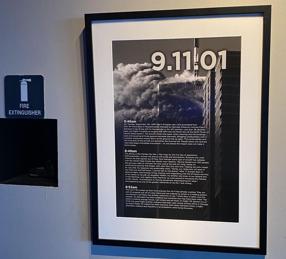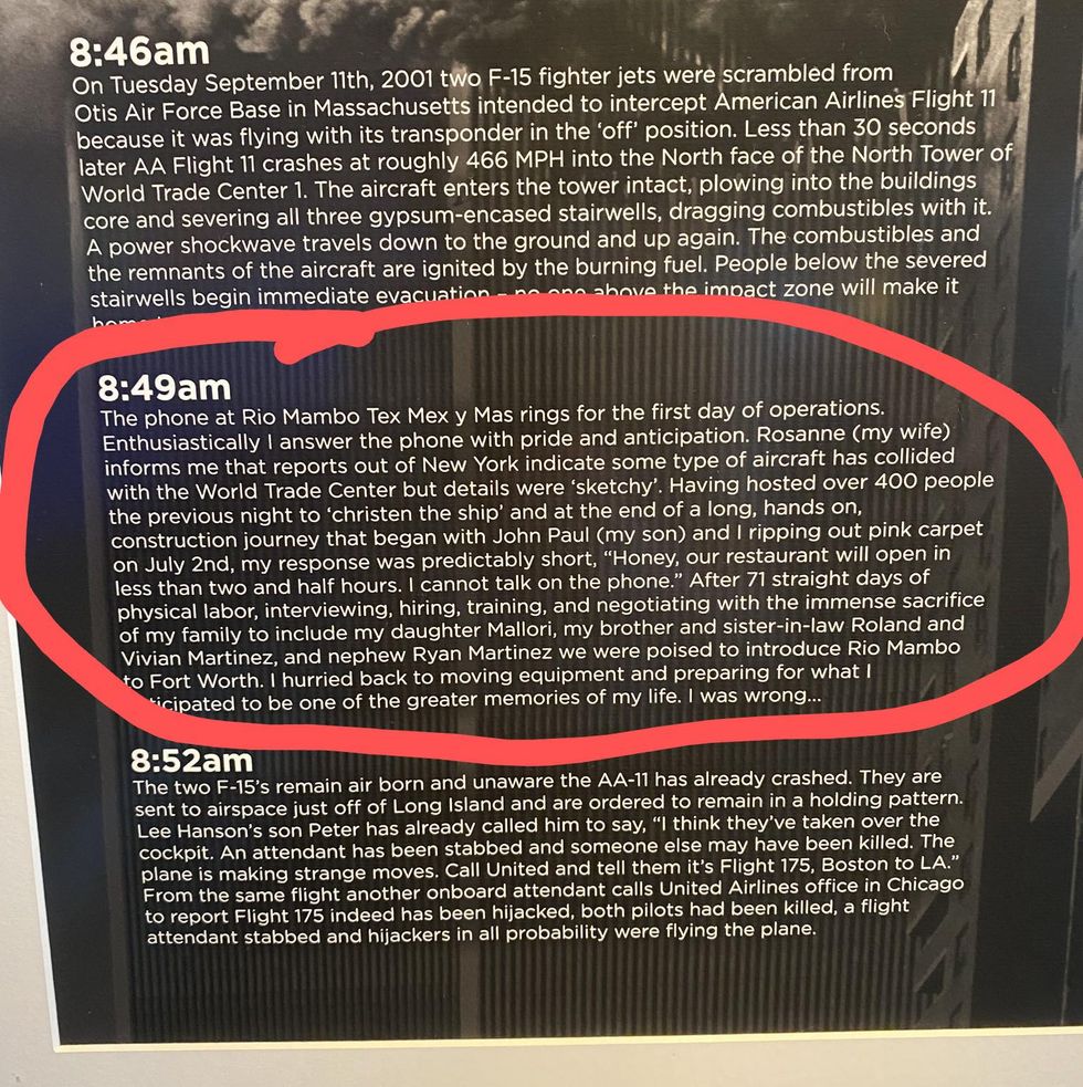 The bar owner, Brent Johnson, features a number of plaques around the establishment detailing his own personal experience trying to open a Tex Mex restaurant during the attacks—essentially turning the day itself into a narrative about his own life, rather than the tragedy.