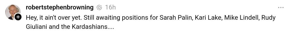 His Instagram boasts only 59 followers—even after Palin amplified his message and tagged his account. Which could explain why Palin isn't getting a nomination for Trump's cabinet.