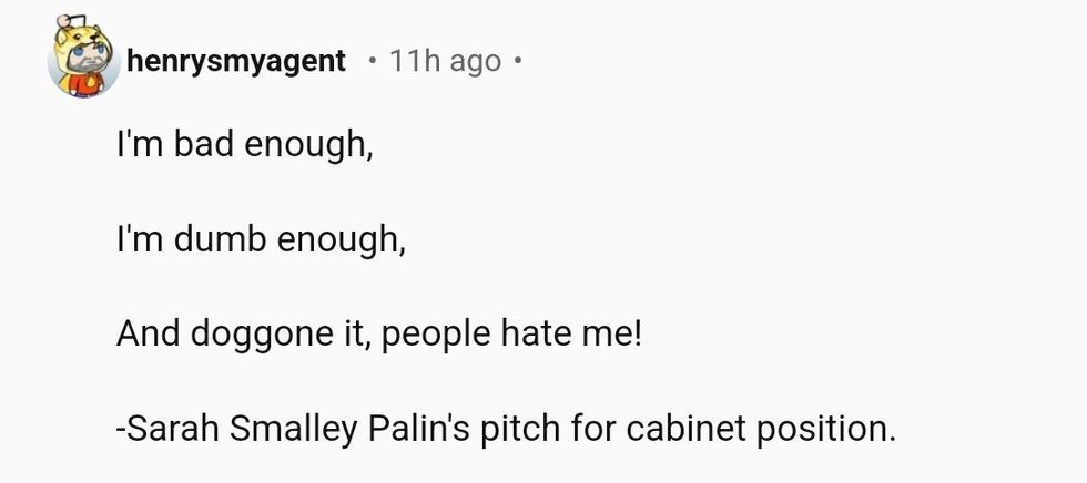To the message asking "What about you!" for Trump's cabinet, Palin issued a "Thank you!" and in the final image, she simply whines "funny how politics work."