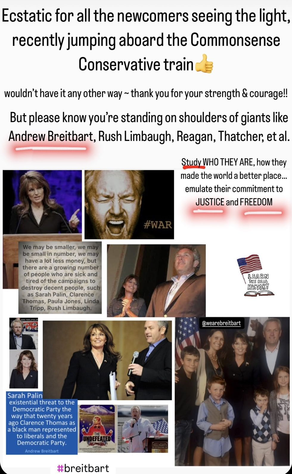 Former Republican Governor of Alaska and failed GOP vice presidential and congressional candidate Sarah Palin took to Instagram stories to vent. She posted a collage of images with Andrew Breitbart and tagged him, calling on people to remember the history of MAGA—or at least her version.