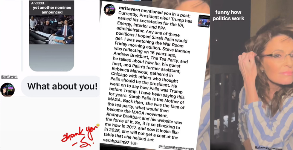In response to his endorsement and an apparent DM, Palin shared a triptych of images on her Instagram stories, tagging both Mr. L and Steve Bannon's War Room podcast—similar to how she had in her Breitbart posts.
