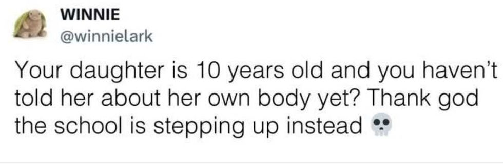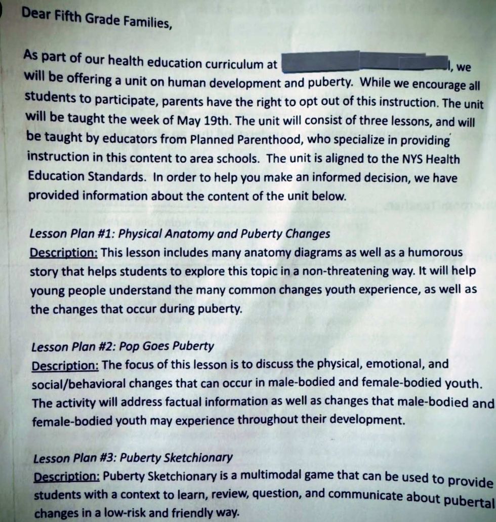 "Excuse me why did my daughter get handed this at school? This is 5th grade, and I didn't sign any paperwork allowing her to attend sex ed.”