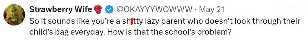"As the OP explains in the thread, she ignored a permission slip from the school giving her the right to opt her child out of this lesson(s). Because she did not do this/forgot to do this, her child was taught with their peers"