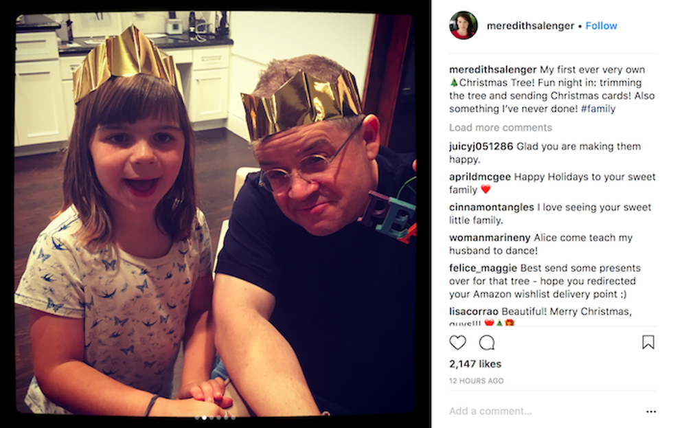 For comedian Patton Oswalt and his daughter Alice, trimming the Christmas tree is a family tradition. But this year, they've introduced new family member Meredith Salenger, who married Oswalt last month, to join in the merriment.