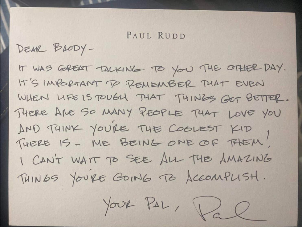 Rudd also wrote a note for Brody, reminding him it was “important to remember that even when life is tough that things get better."