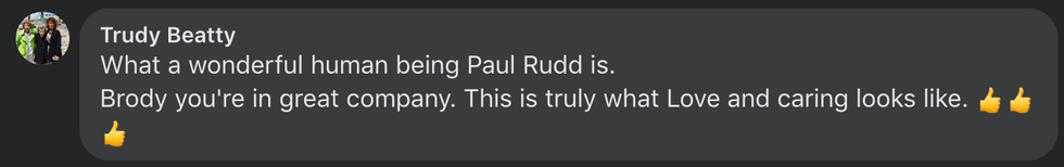 "Guys more tears," she captioned her Facebook post, adding, "Paul Rudd is an amazing human being. Brody and Paul are on texting terms now the text message got me."