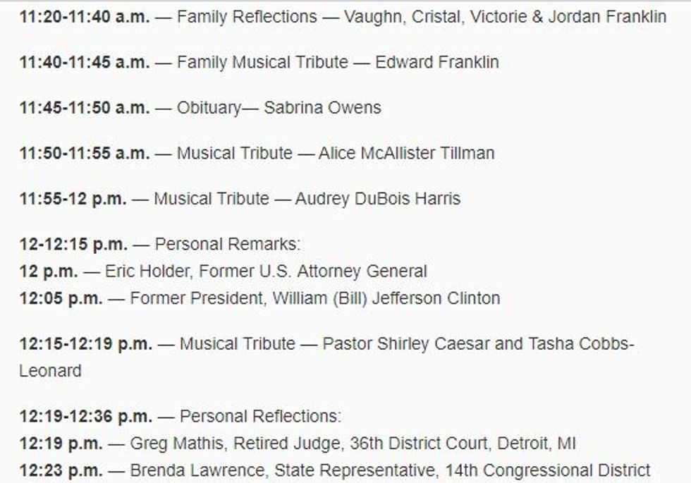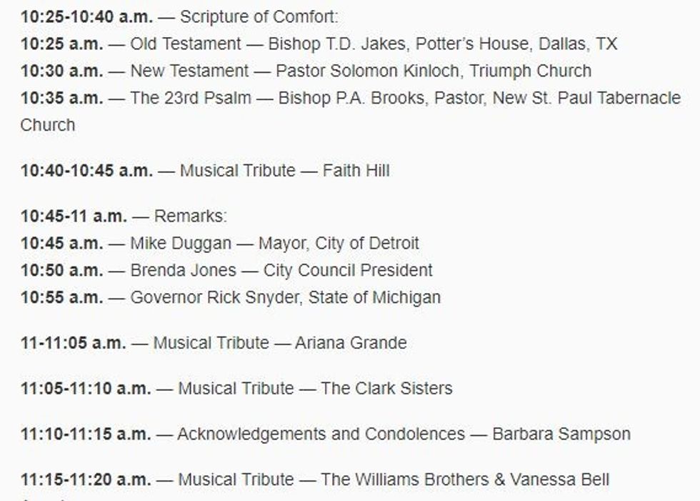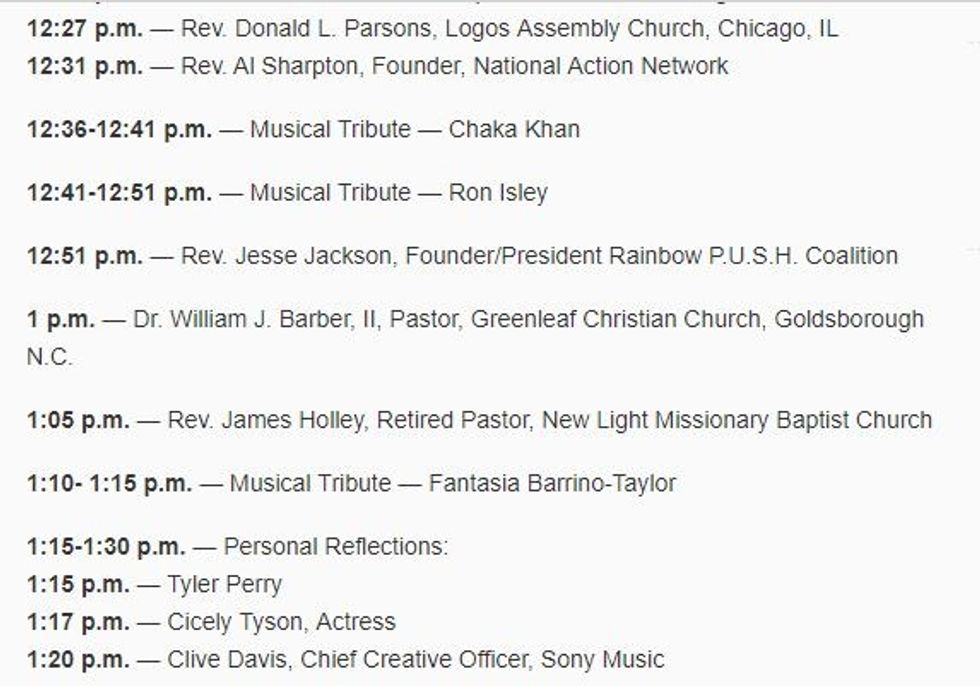 Even so, there is quite the A list of attendee slated to perform such as Stevie Wonder, Jennifer Hudson, Ariana Grande, Faith Hill, Fantasia, Ronald Isley, Yolanda Adams, Jennifer Hioliday, Shirley Caesar, Chaka Khan and The Clark Sisters. Those speaking include Cicely Tyson, Jesse Jackson and Former President Bill Clinton.