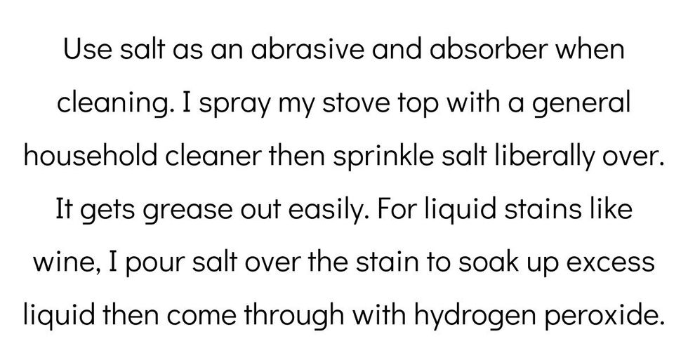 Use salt as an abrasive and absorber when cleaning. I spray my stove top with a general household cleaner then sprinkle salt liberally over the top. It gets grease out easily.