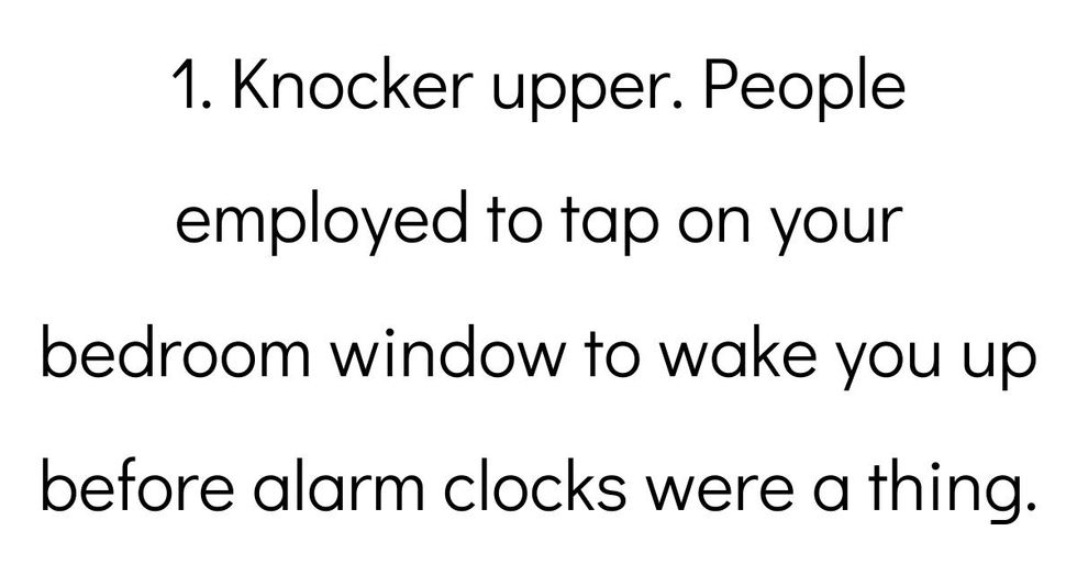 Knocker upper. People employed to tap on your bedroom window to wake you up before alarm clocks were a thing.