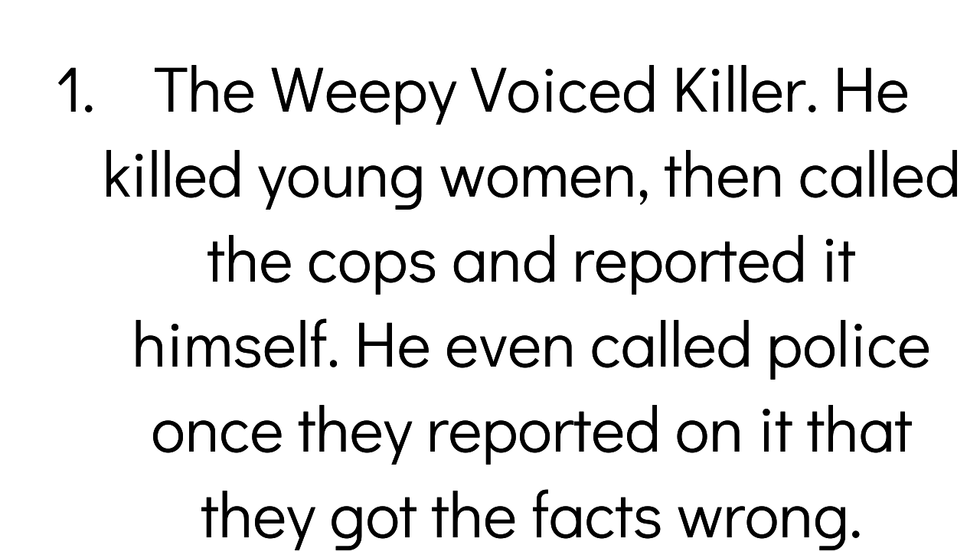 The Weepy Voiced Killer. He killed young women, then called the cops and reported it himself. He even called police once they reported on it that they got the facts wrong.