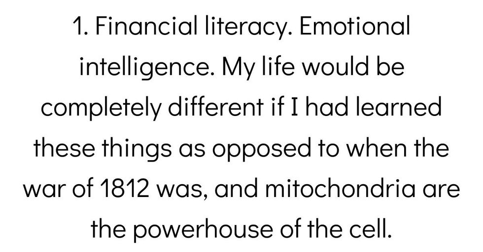 Financial literacy. Emotional intelligence. My life would be completely different if I had learned these things as opposed to when the war of 1812 was, and mitochondria are the powerhouse of the cell.