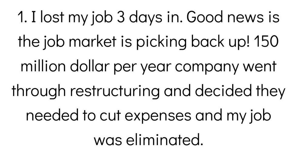 I lost my job 3 days in. Good news is the job market is picking back up!