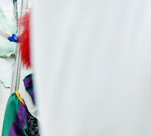 "The clown is hiding behind the clothes flapping in the wind on the clothesline."