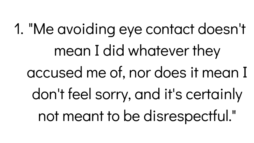 Something I wish my teachers knew when I was growing up; me avoiding eye contact doesn't mean I did whatever they accused me of, nor does it mean I don't feel sorry, and it's certainly not meant to be disrespectful. It's just that I don't do well with eye contact.