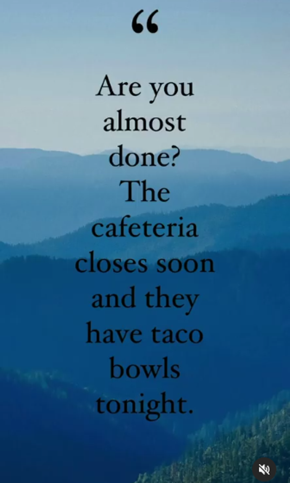 "Are you almost done? The cafeteria closes soon and they have taco bowls tonight."