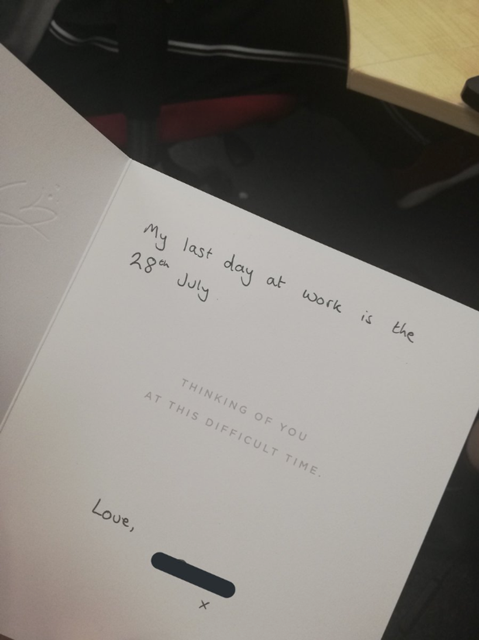 But one person found a very clever (and hilarious) way of letting their employer know that they'd soon be down a team member—with a condolence card.