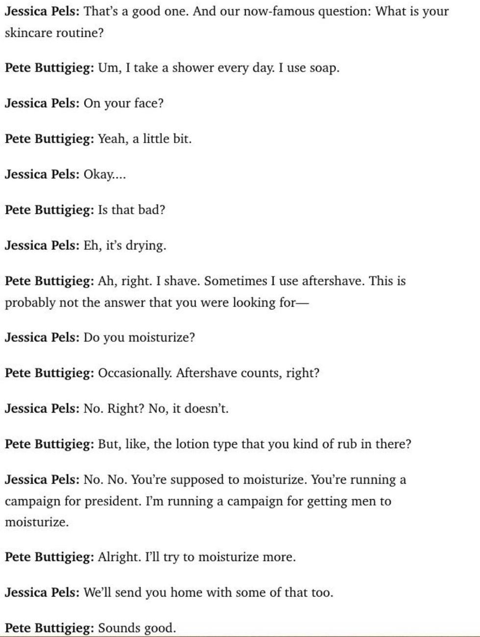 During Cosmopolitan's "Candidates Come to Cosmo" series, Buttigieg was asked the signature question: What is your skincare routine?
