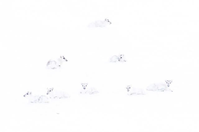 Spot The Reindeer, by Francis De Andres, shows white Arctic reindeer almost hidden against a snowy background in the Norwegian archipelago of Svalbard.