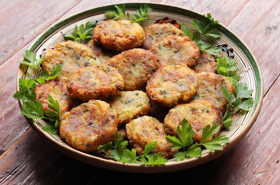 "To make the breadcrumbs, you can run stale bread through a food processor. Make sure the breadcrumbs are dry — you'll want them to be almost powdery when ground up. If your crumbs aren't dry, toast them in the oven at 250 degrees Fahrenheit for about 20 minutes (but don't let them burn).