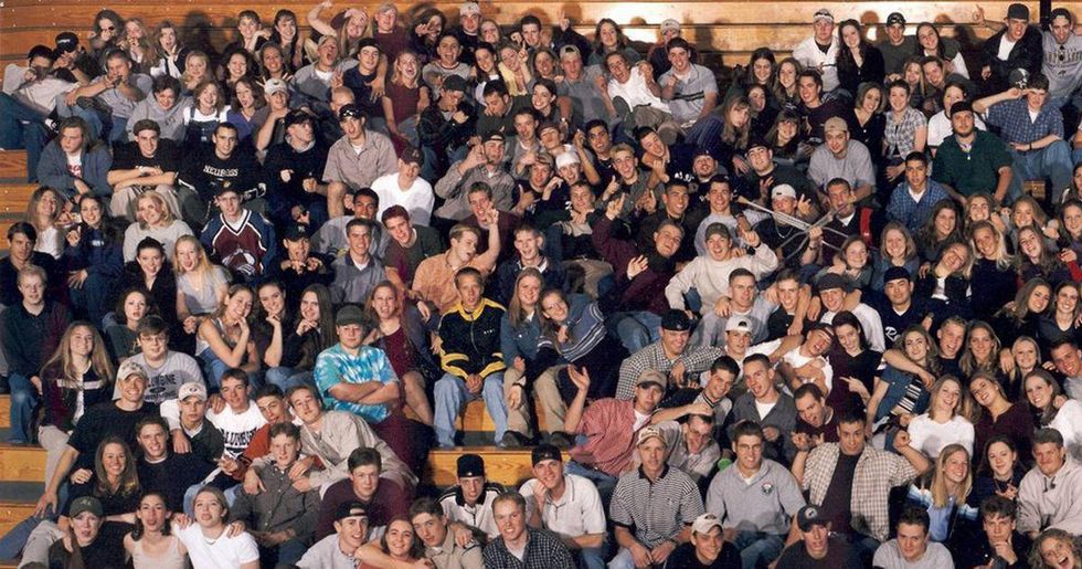 In the top left corner there's a small group of people pretending to shoot at the camera. The one in the black hat is Eric Harris and the one with the sunglasses is Dylan Klebold, the shooters of the Columbine massacre. This photo was only taken a few weeks beforehand.