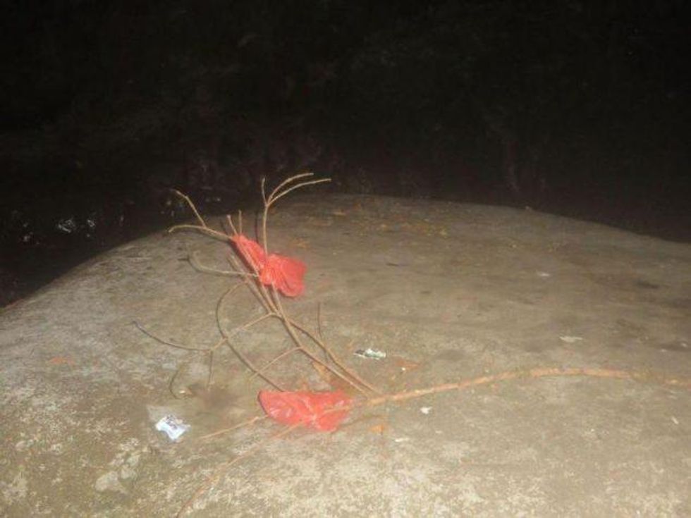 Photo taken in the black of night by Kris Kremers, Lisanne Froon, or an unknown person before disappearing in a Panama jungle. The picture is thought to be of a trail marker crafted by one of the two girls. Their bones were found months later but the cause of death remains unsolved.