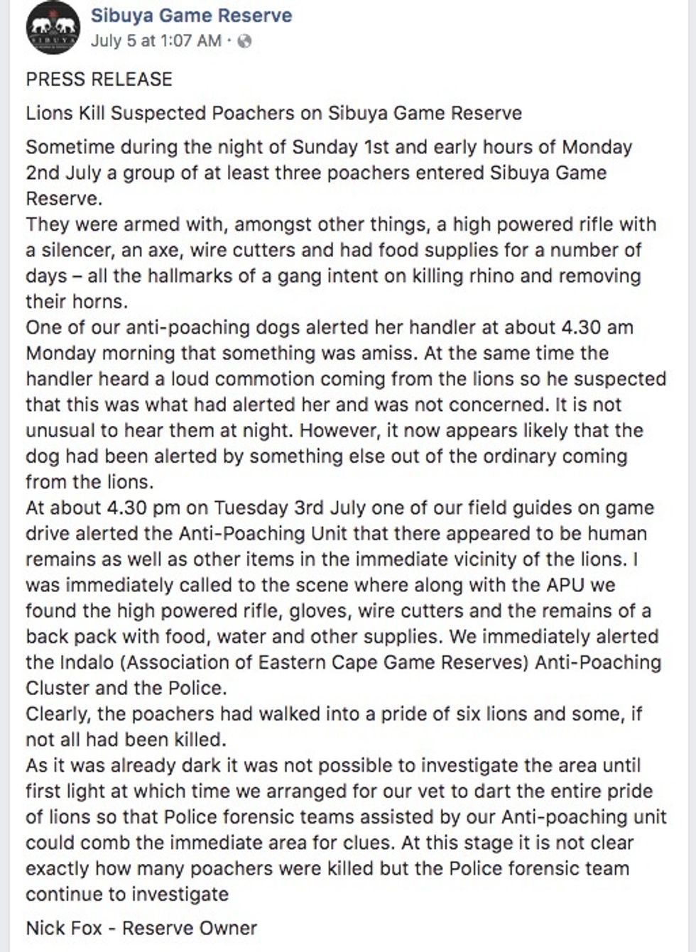 The bodies of the poachers—or body parts rather—were found on July 3rd when a field guide was driving though and discovered what he thought were human remains as well as the aforementioned weapons and equipment amidst a pride of six lions.