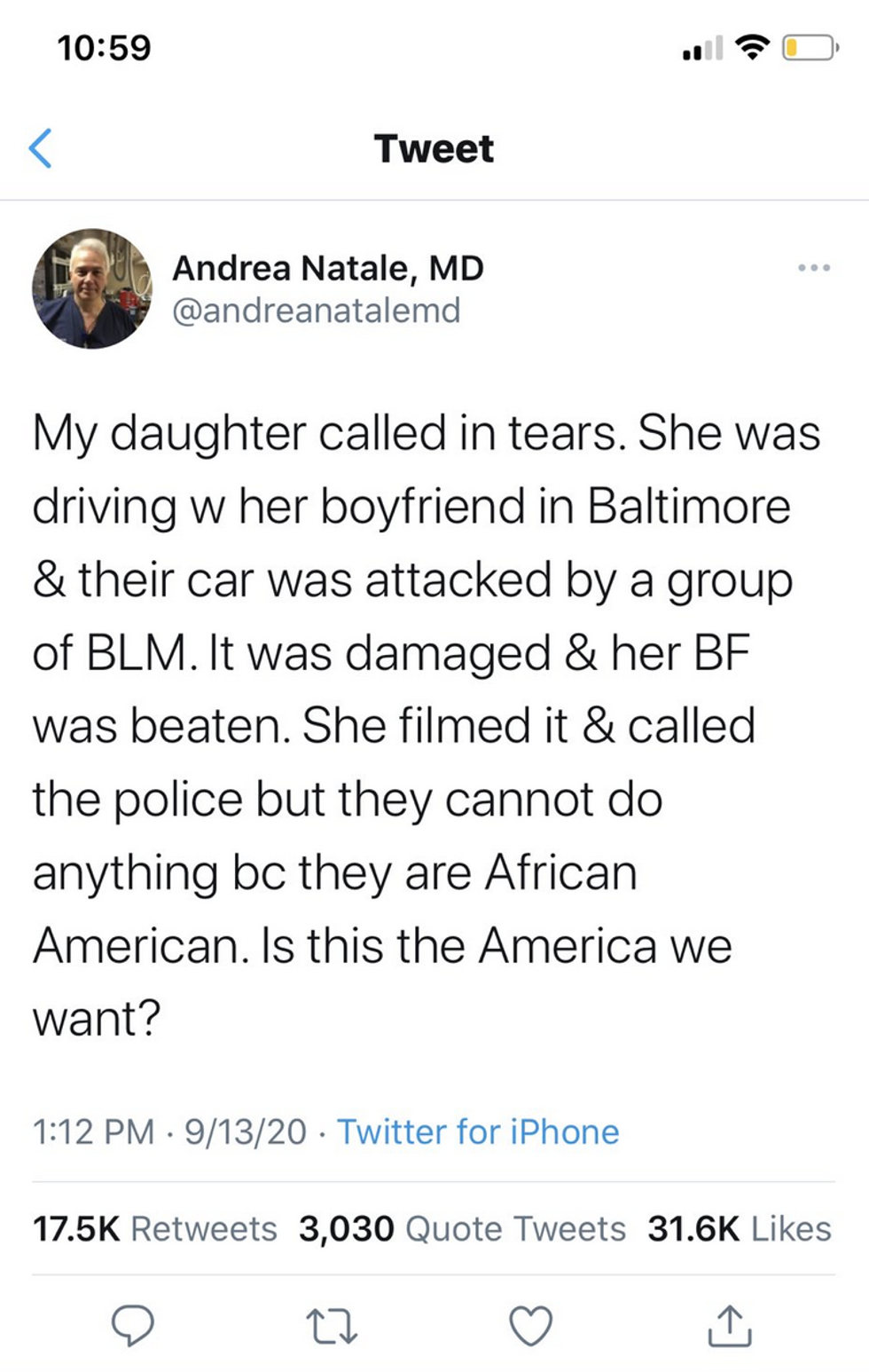 "My daughter called in tears. She was driving [with] her boyfriend in Baltimore & their car was attacked by a group of BLM. It was damaged & her BF was beaten."