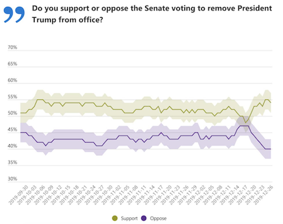 But more troubling for the Trump camp, support for Trump remaining in office fell to an all time low on December 24 and stayed there. Now only 40% of voters support President Trump staying in the Oval Office until the end of his term—or rather oppose the Senate convicting him during his trial.