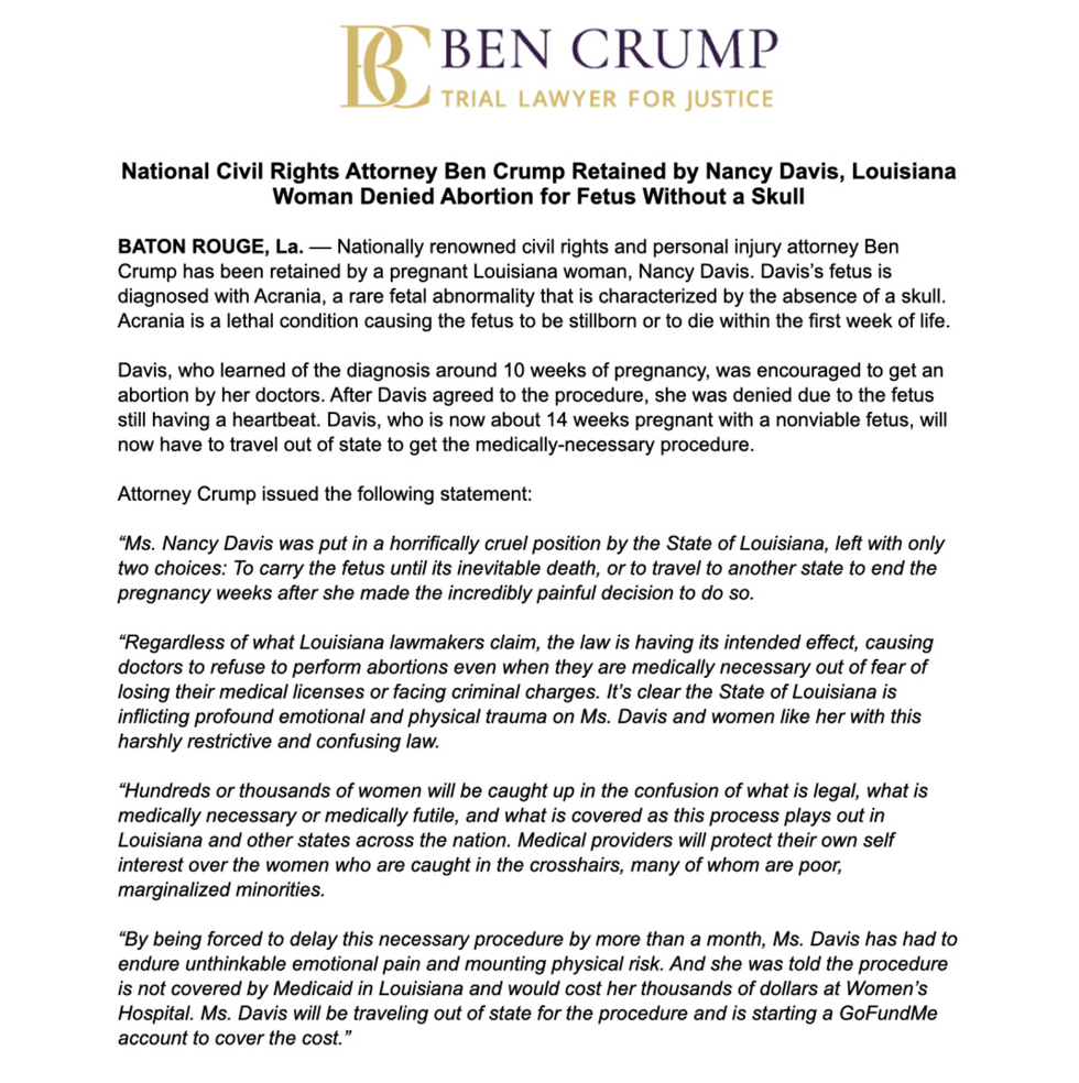\u201cMEDIA ALERT: @AttorneyCrump has been retained by a pregnant woman denied an abortion because doctors feared penalties under a new Louisiana law. Her fetus has acrania, the absence of a skull, and can't survive outside the womb. Now, she has to travel out of state for treatment.\u201d— Ben Crump Law, PLLC (@Ben Crump Law, PLLC) 1660942912