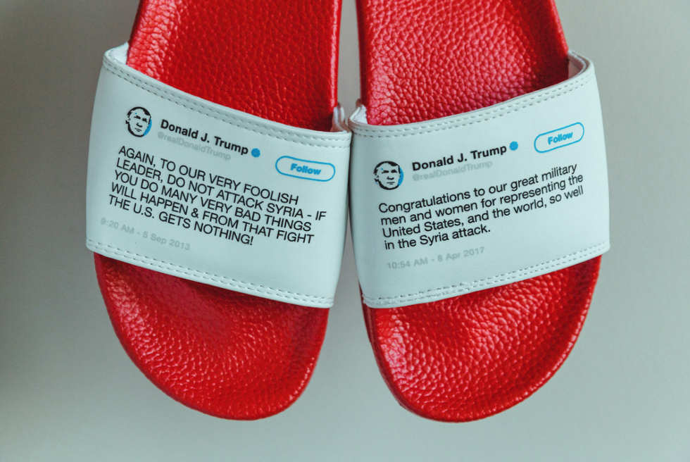 Sam Morrison, like many observant Americans, noticed in 2017 that President Donald Trump often tweets opinions that directly contradict earlier posts. An artist and advertiser, 27-year-old Morrison quickly thought of a fun, artistic way to call President Trump out on these flip-flopping opinions: making actual flip-flops that illustrate them.