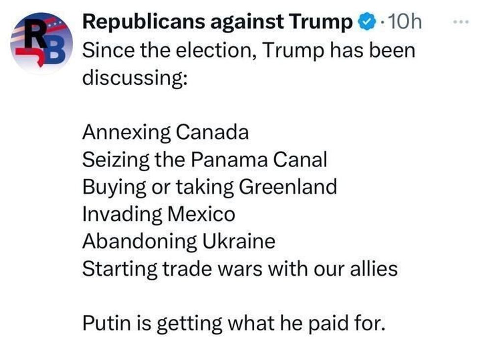 He promised to stop russian war in Ukraine in 24 hours after being elected, and have no wars. Now he threatens Canada, Denmark, Panama with occupation of their territories?