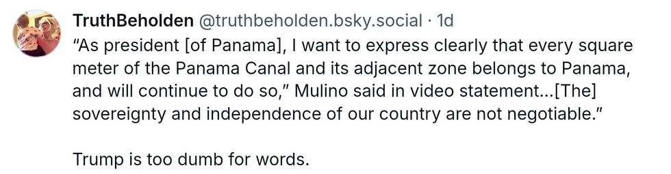 He also falsely claimed China was controlling the canal. Unwilling to be bullied by Trump or to allow him to spout revisionist history and lies unchallenged, Panamanian President José Raúl Mulino responded to the threat with a video message posted to X.