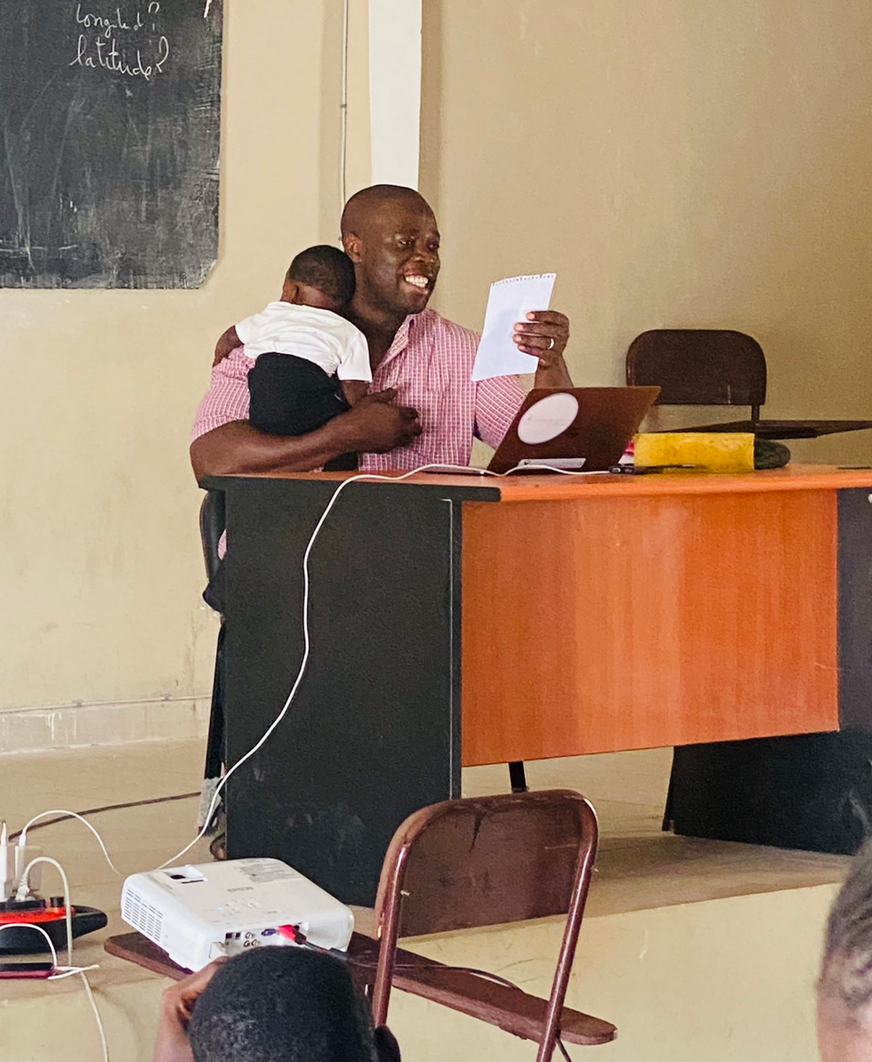 A Senegalese professor in southeast Dakar found internet fame after he posted two photos of himself teaching class while gently holding a baby of one of his students in his arms.