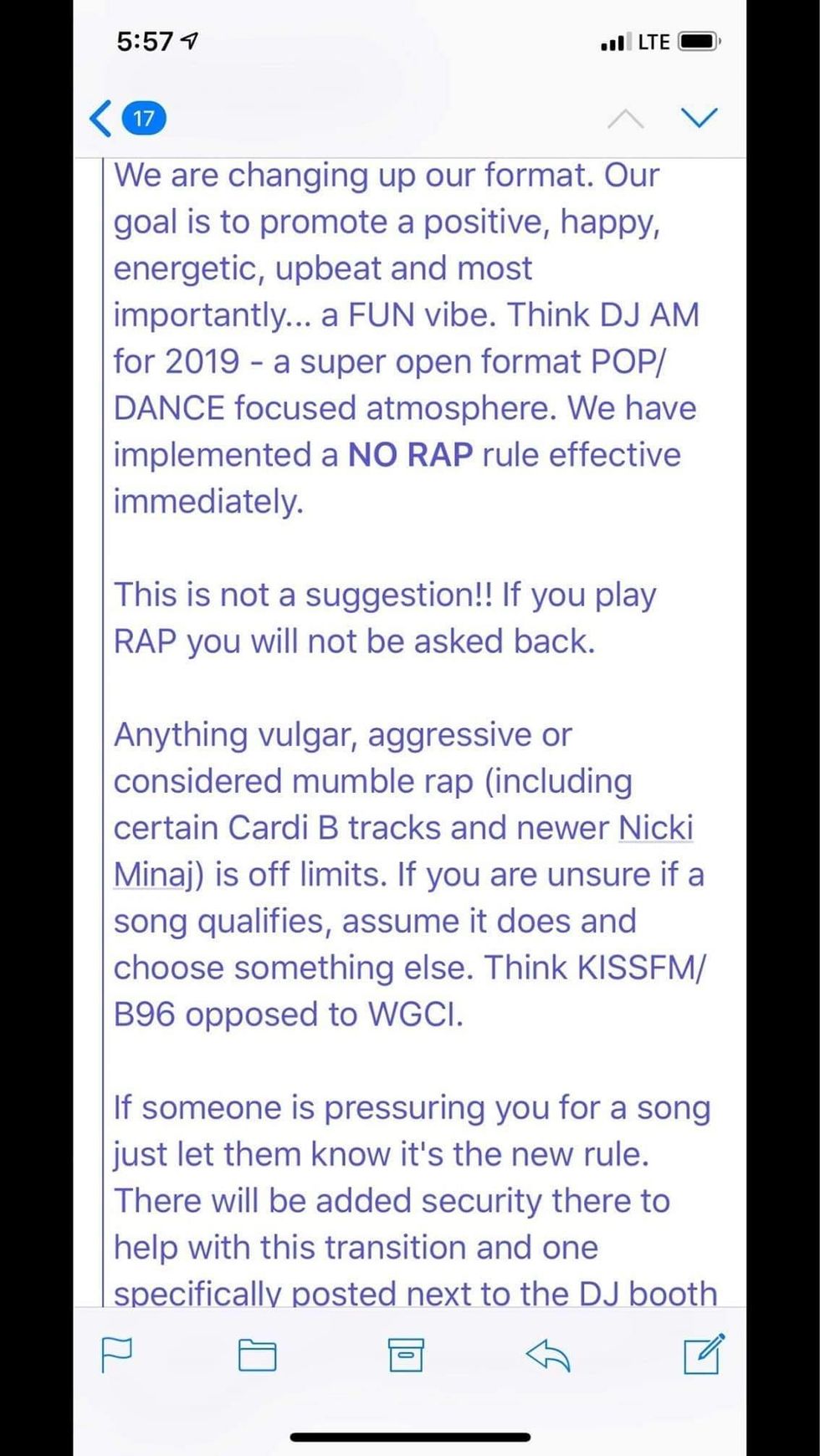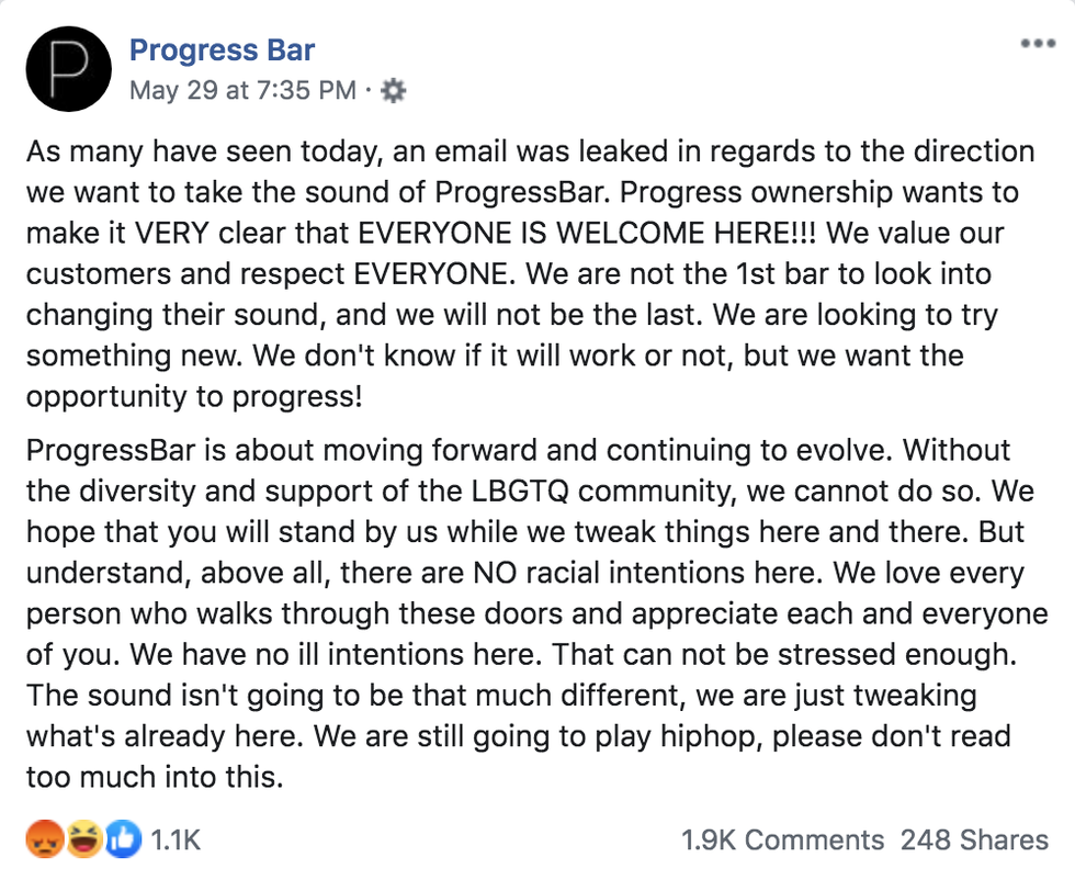 "Progress ownership wants to make it VERY clear that EVERYONE IS WELCOME HERE!!! We have no ill intentions here. That can not be stressed enough. … We are still going to play hiphop, please don't read too much into this."