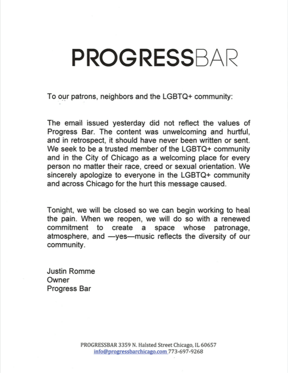 Many Chicagoans pledged to boycott Progress Bar for the foreseeable future.
