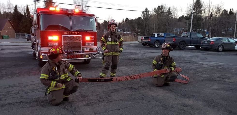 Behind two fellow fire fighters holding a hose with the message "Will you marry me?" her boyfriend Lt. Kelby Ueltschi is down on one knee holding out a ring.