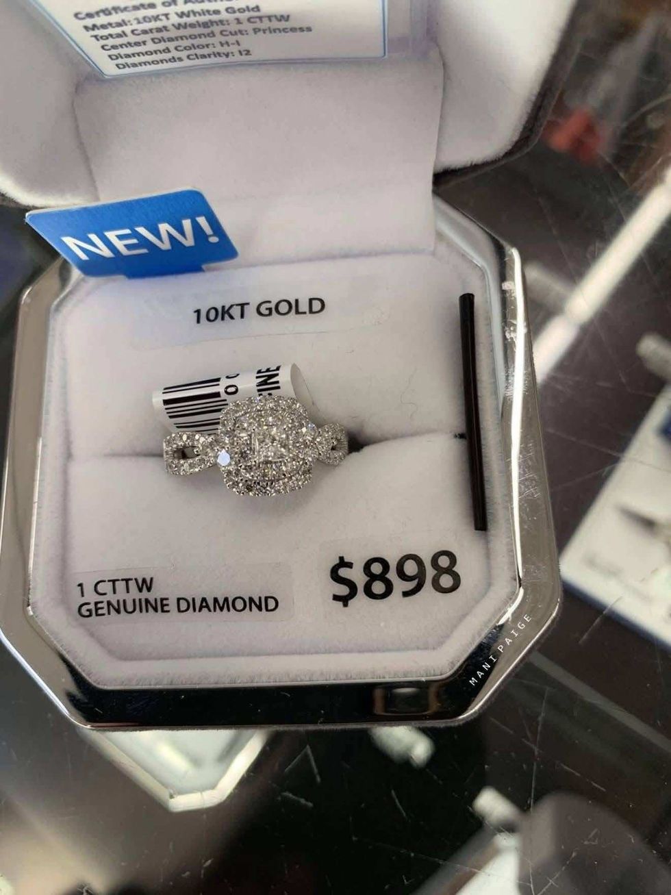 Threads user @prissyxoxo25 shared a pair of images on the platform, one featuring a text message exchange and the other showing an engagement ring from Walmart, priced at $898.