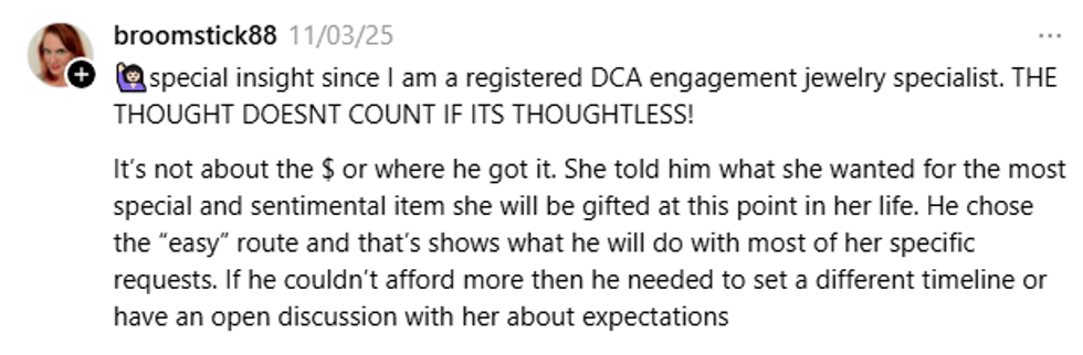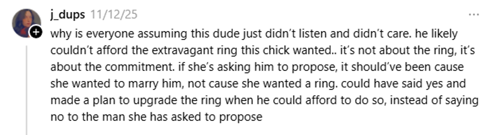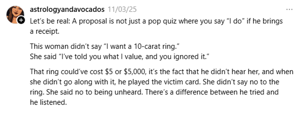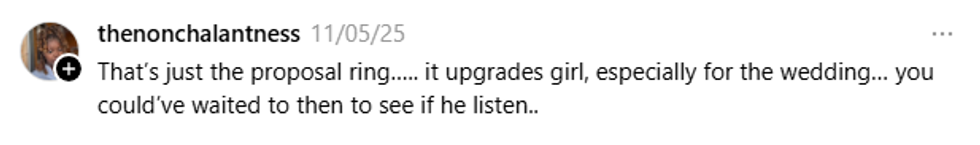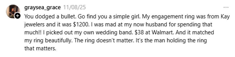 "I've told you the kind of ring I wanted more than once, and you showed up with something from Walmart!"