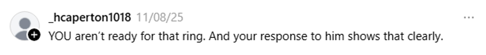 In the text message exchange, a man confronts his girlfriend, who turned him down over an engagement ring.